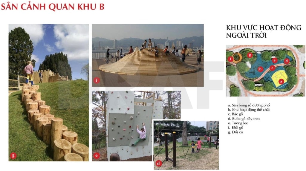 Khu vực hoạt động ngoài trời khu B được thiết kế các tiểu mục mang tính vận động thể chất cao. Đây là nơi cư dân và các thế hệ ông chủ tương lai rèn luyện thể lực nâng cao trí tuệ, sức khỏe với : sân bóng rổ, đồi cỏ, tường leo, bước gỗ dây treo, tường gỗ, đồi cỏ …..Mang ý nghĩa phong thủy là hệ ” mộc”