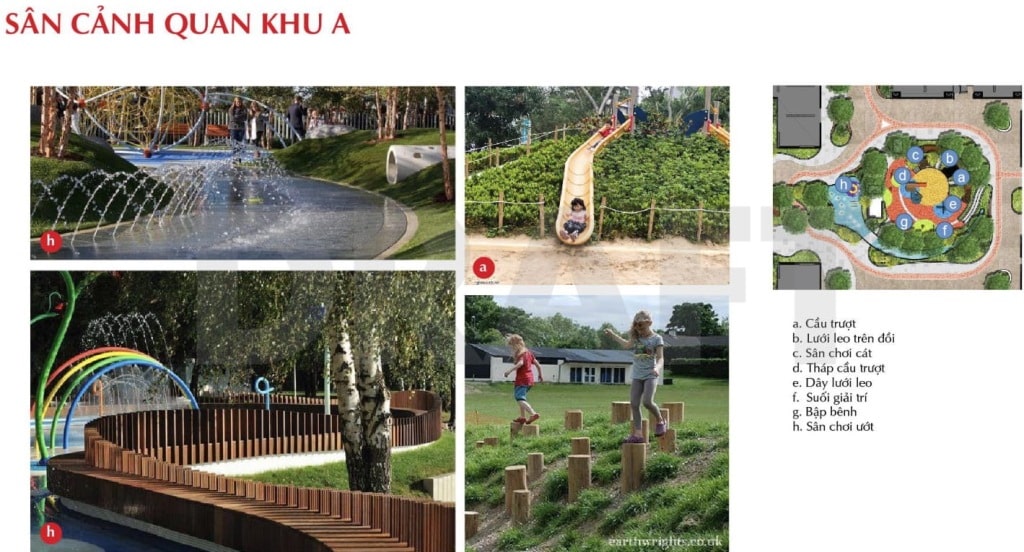 Trong khu vực hoạt động ngoài trời khu A dành cho trẻ em được bố trí các khu vận động như : tháp cầu trượt, lưới leo trên đồi, sân chơi cát, suối giải trí với hồ nước và đài phun nước, sân chơi ướt nơi các bé thỏa thích vui đùa gải nhiệt mùa nắng nóng. Mang ý nghĩa phong thủy là hệ ” thủy”