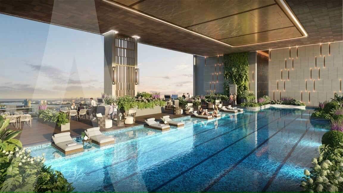 Hồ bơi rộng lớn tại tầng 20 thoáng mát, các tiện ích chung tại tầng 20 như khu vườn treo, khu nướng BBQ.