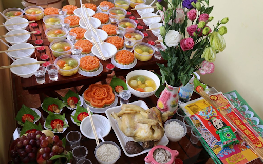 Các đồ cúng bố mẹ nên chuẩn bị thêm 1 con gà luộc, bánh kẹo, cháo trắng, mâm ngũ quả, 1 đĩa xôi chia làm 12 phần nhỏ và 1 phần lớn, heo quay chia thành 12 miếng nhỏ 1 miếng lớn, trầu têm cánh phượng cũng chia 12 phần nhỏ và 1 phần lớn.