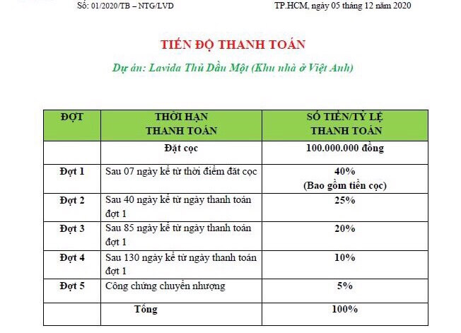 Phương thúc thanh toán Lavida được dự kiến vô cùng linh hoạt cho nhà đầu tư :