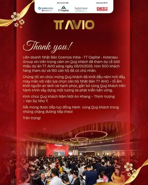 Cảm ơn sự hiện diện của tất cả khách hàng đã góp phần vào sự thành công rực rỡ của LỄ GIỚI THIỆU DỰ ÁN NEW YEAR NEW LIFE! TT AVIO luôn cam kết đồng hành cùng Quý khách trên hành trình kiến tạo một không gian sống chất lượng, hiện đại và bền vững!