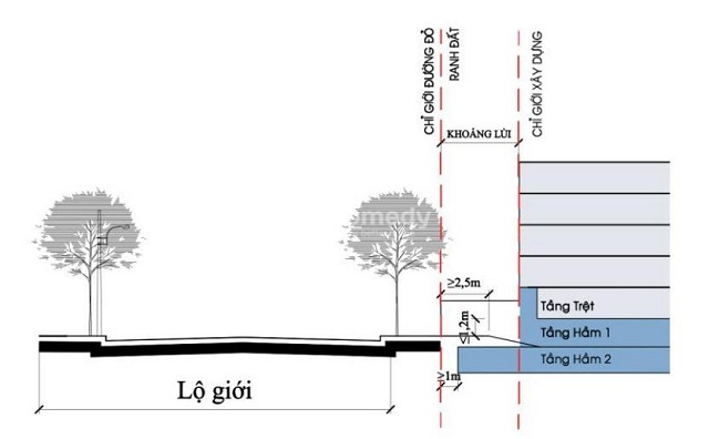 Nhìn vào hình minh họa bạn có thể thấy khoảng cách giữa đường chỉ giới xây dựng và đường chỉ giới đường đỏ chính là khoảng lùi. Khoảng lùi này sẽ phải phụ thuộc vào độ cao của công trình và độ cao của lộ giới.