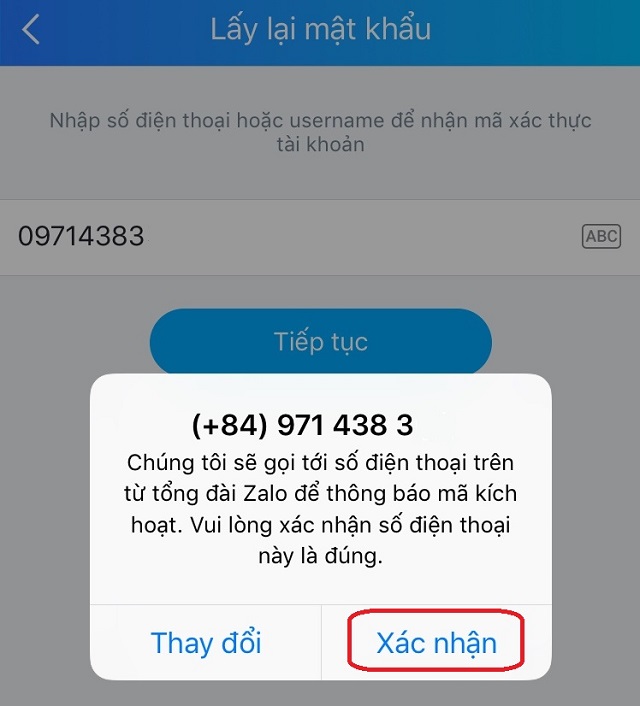 Sau khi bạn nhập số điện thoại ứng dụng sẽ chuyển sang giao diện xác nhận xem đó có đúng số điện thoại và xác nhận. Tiếp theo ứng dụng Zalo sẽ chuyển sang giao diện nhập mã kích hoạt. Nhiệm vụ của bạn lúc này là chờ tổng đài Zalo gọi đến để thông báo mã kích hoạt.