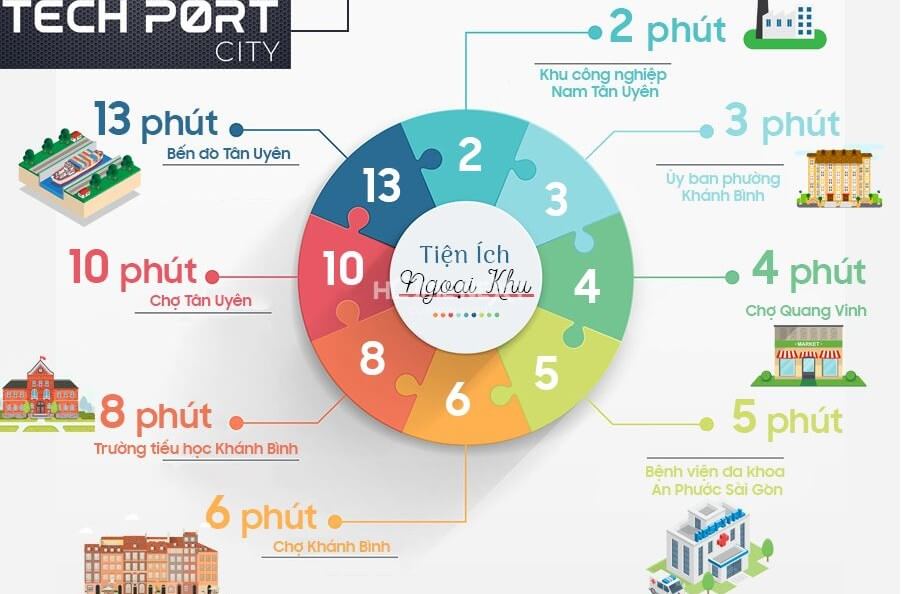 Dự án Techport City được xây dựng tại lô DV – B2, đường D5 và N2, KCN Nam Tân Uyên, tỉnh Bình Dương. Xung quanh dự án là hàng loạt các tuyến đường lớn như: DT746, HL409, DT747,… Ngoài ra, dự án còn nằm gần bến đò Tân Uyên trên sông Đồng Nai. Nhờ đó việc lưu thông bằng cả đường bộ và đường thủy cực kỳ thuận lợi. Từ dự án có thể dễ dàng đi thẳng đến TPHCM và trung tâm TP Hội An.