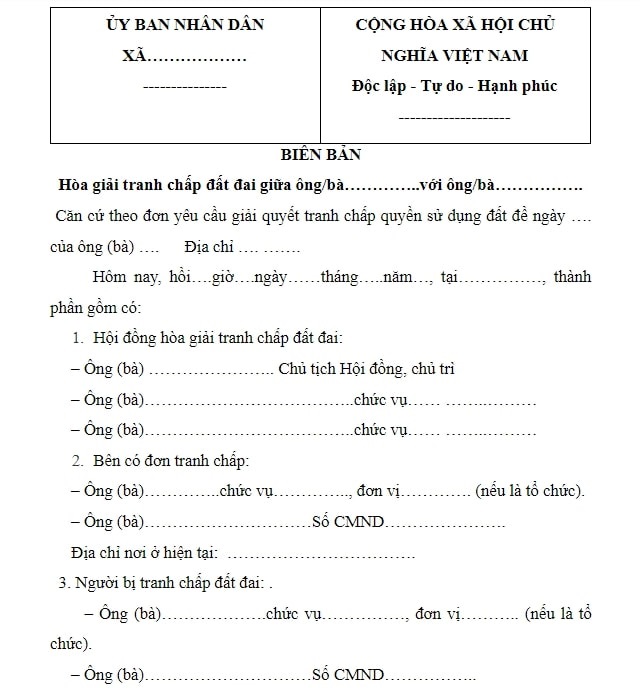 - Biên bản hoà giải tại UBND xã, phường có chữ ký của các bên tranh chấp và dấu mộc của chủ tịch UBND nơi giải quyết hòa giải